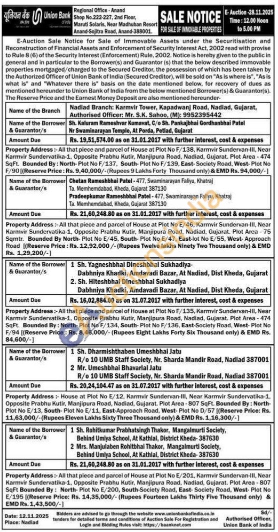 Property Address: House at Plot No E/12, Karmvir Sundervan-III, Near Karmvir Sundervatika-1, Opposite Prabhu Kutir, Manjipura Road, Nadiad, Gujarat. Plot Area-807 SqFt. Bounded By: North-Plot No E/13, South- Plot No E/11, East-Approach Road, West- Plot No D/57