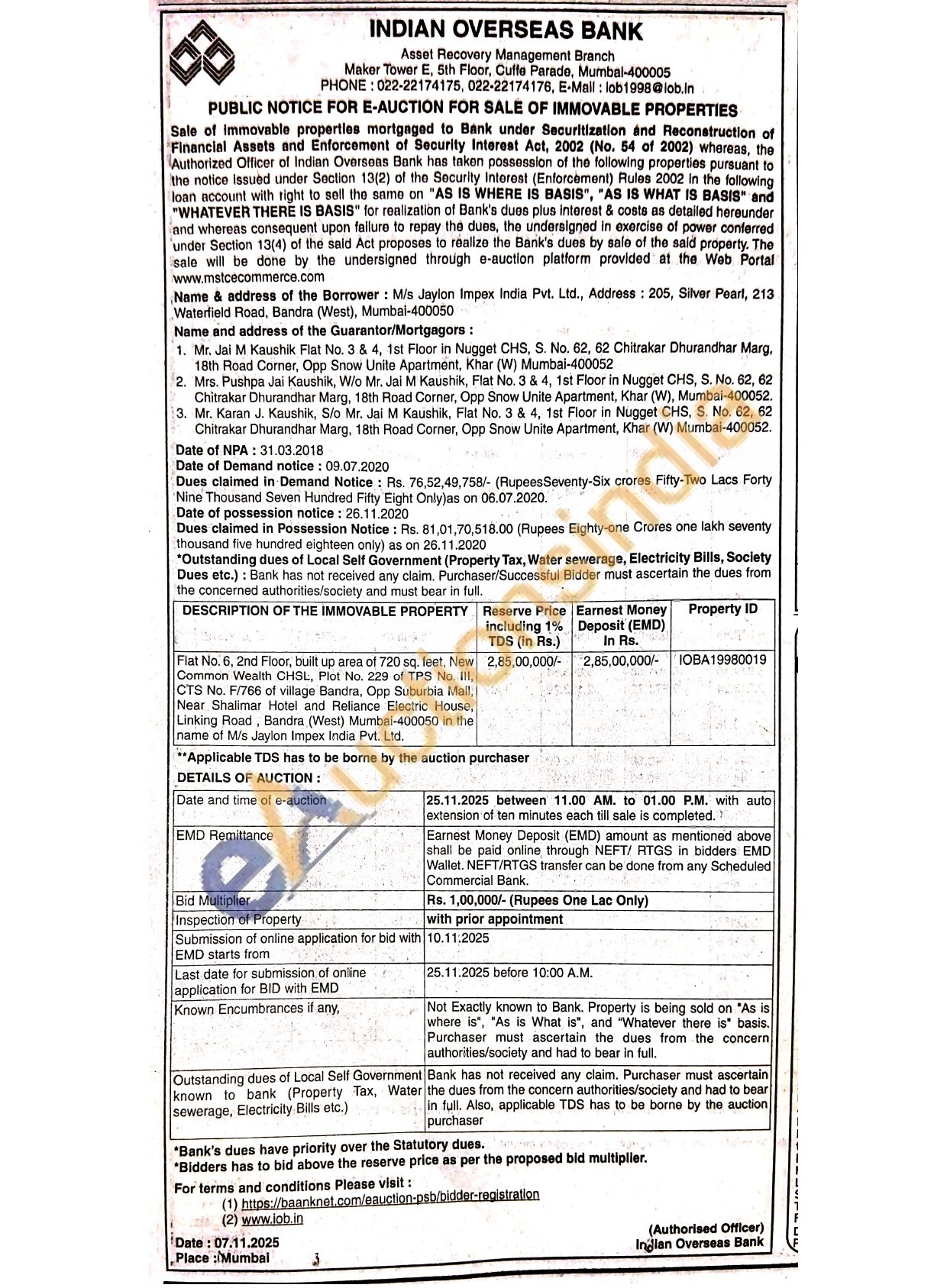 Flat No. 6, 2nd Floor, built up area of 720 sq. feet, New Common Wealth CHSL, Plot No. 229 of TPS No. III, CTS No. F/766 of village Bandra, Opp Suburbia Mall, Near Shalimar Hotel and Reliance Electric House, Linking Road, Bandra (West) Mumbai-400050 in the name of M/s Jaylon Impex India Pvt. Ltd