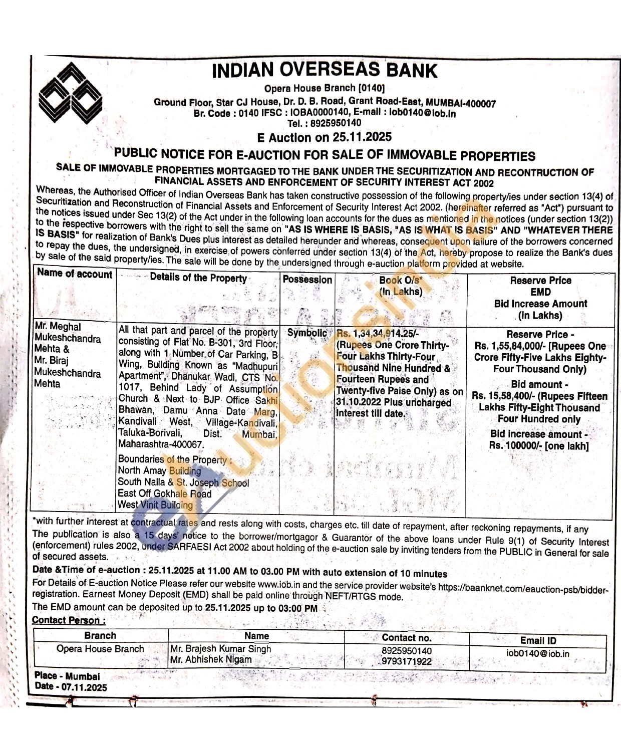 All that part and parcel of the property consisting of Flat No. B-301, 3rd Floor, along with 1 Number of Car Parking, B Wing. Building Known as "Madhupuri Apartment", Dhanukar Wadi, CTS No. 1017, Behind Lady of Assumption Church & Next to BJP Office Sakhi Bhawan, Damu Anna Date Marg, Kandivali West, Village-Kandivali, Taluka-Borivali, Dist. Mumbai, Maharashtra-400067. Boundaries of the Property: North Amay Building South Nalla & St. Joseph School East Off Gokhale Road West Vinit Building