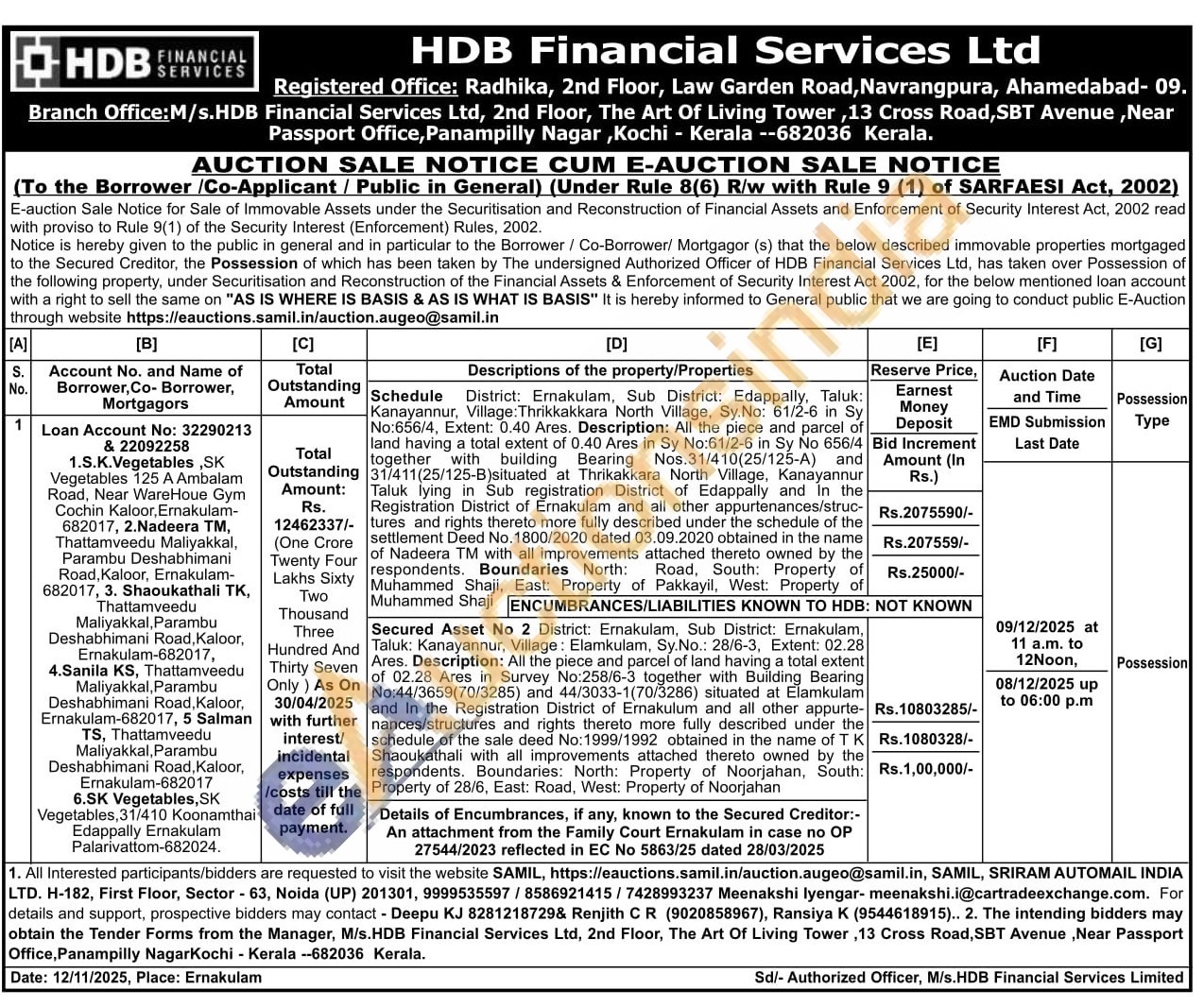 Schedule District: Ernakulam, Sub District: Edappally, Taluk: Kanayannur, Village: Thrikkakkara North Village, Sy. No: 61/2-6 in Sy No:656/4, Extent: 0.40 Ares. Description: All the piece and parcel of land having a total extent of 0.40 Ares in Sy No:61/2-6 in Sy No 656/4 together with building Bearing Nos.31/410(25/125-A) and 31/411(25/125-B)situated at Thrikakkara North Village, Kanayannur Taluk lying in Sub registration District of Edappally and in the Registration District of Ernakulam and all other appurtenances/struc-tures and rights thereto more fully described under the schedule of the (One Crore settlement Deed No. 1800/2020 dated 03.09.2020 obtained in the name Twenty Four of Nadeera TM with all improvements attached thereto owned by the respondents. Boundaries North: Road, South: Property of Muhammed Shaji, East: Property of Pakkayil, West: Property of