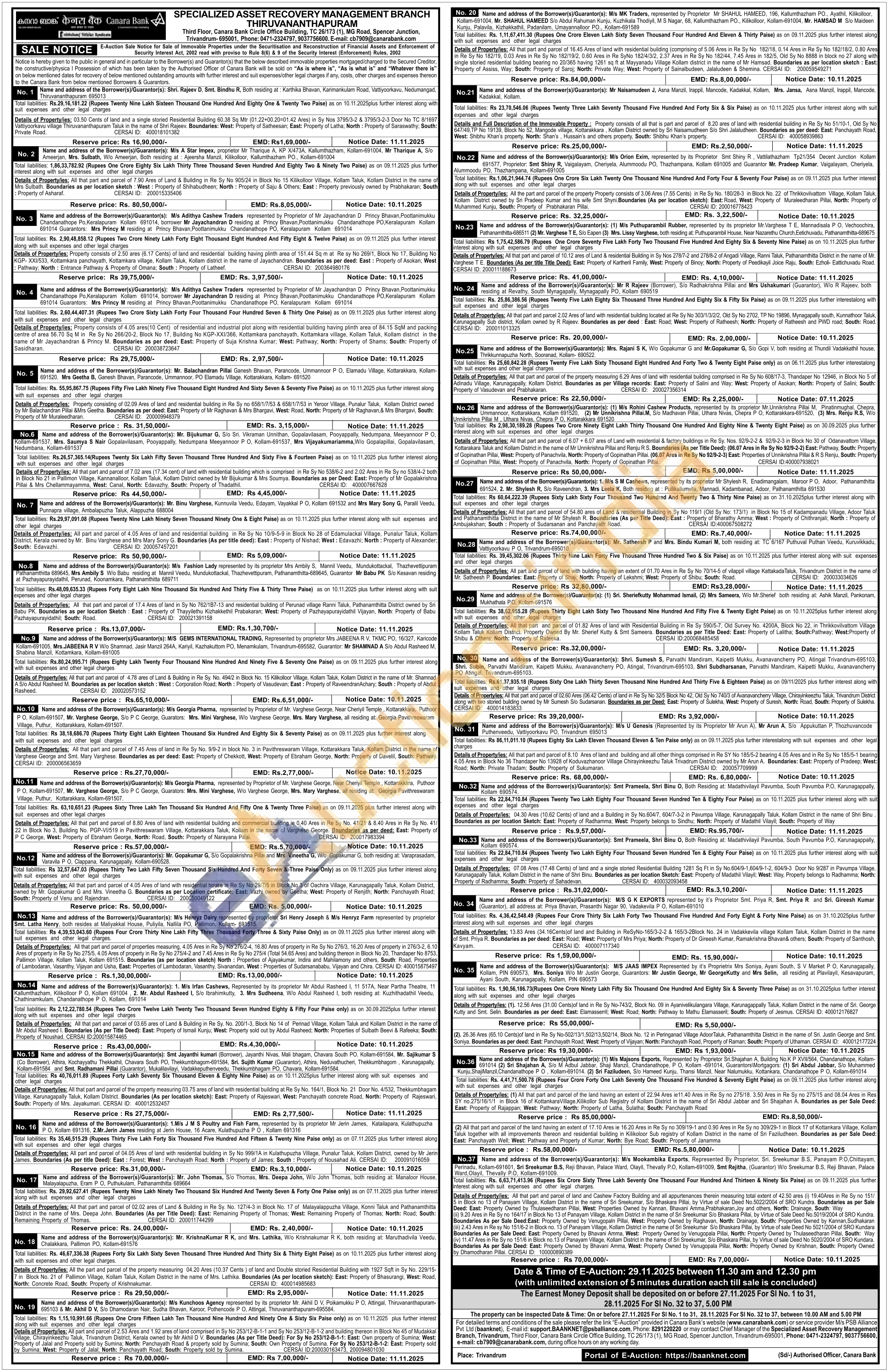 Contact Phone: 0471-2324797, 9037756600, e-mail: cb7909@canarabank.com