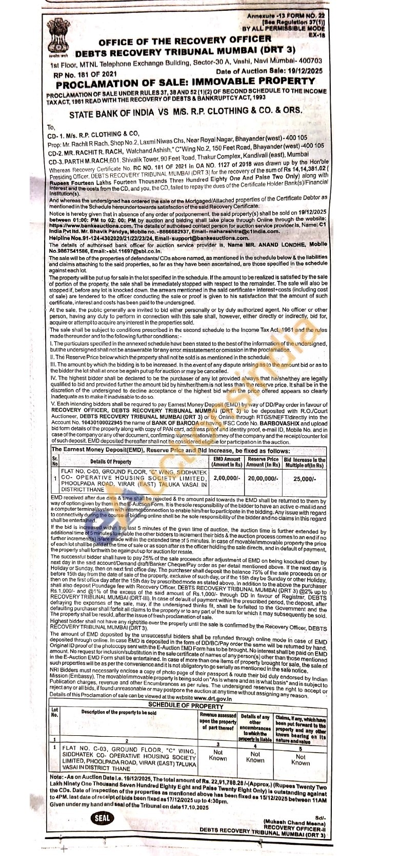 FLAT NO, C-03, GROUND FLOOR, "C" WING, SIDDHATEK CO-OPERATIVE HOUSING SOCIETY LIMITED, PHOOLPADA ROAD, VIRAR (EAST) TALUKA VASAI IN DISTRICT THANE