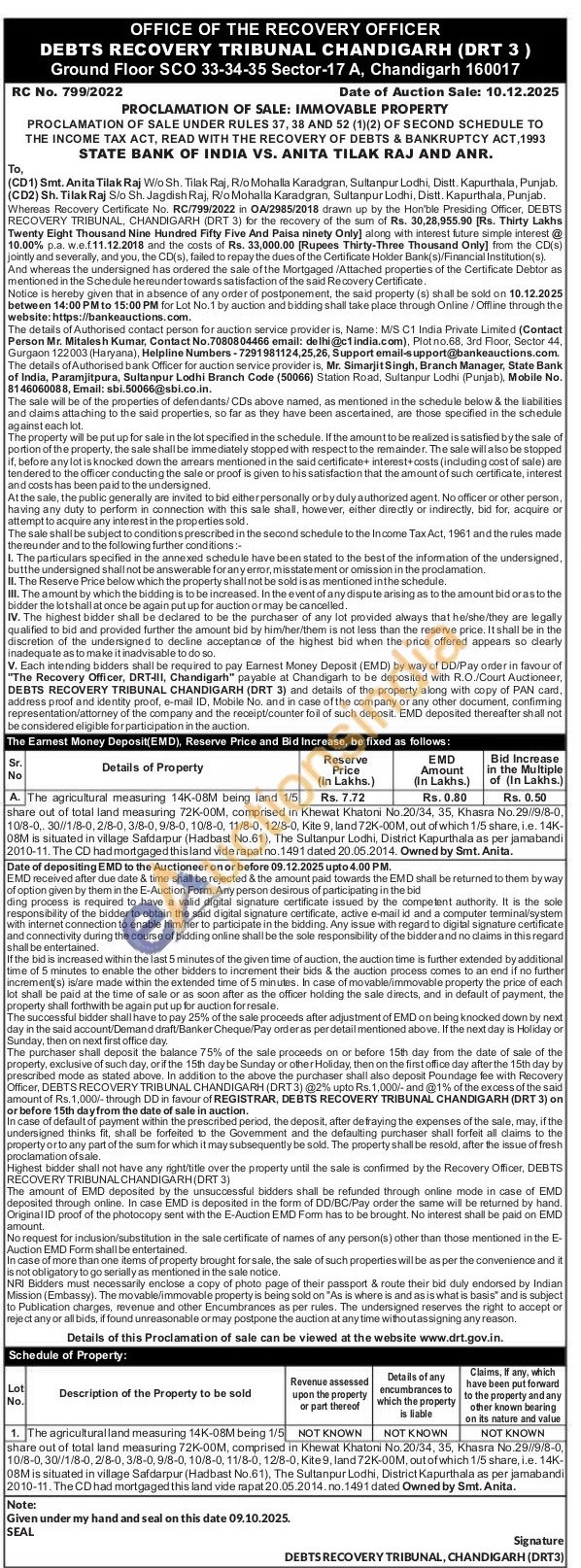 The agricultural measuring 14K-08M being land 1/5 share out of total land measuring 72K-00M, comprised in Khewat Khatoni No.20/34, 35, Khasra No. 29/9/8-0, 10/8-0, 30/11/8-0,2/8-0, 3/8-0,9/8-0, 10/8-0, 11/8-0, 12/8-0, Kite 9, land 72K-00M, out of which 1/5 share, i.e. 14K-08M is situated in village Safdarpur (Hadbast No.61), The Sultanpur Lodhi, District Kapurthala as per jamabandi 2010-11. The CD had mortgaged this land vide rapat no. 1491 dated 20.05.2014. Owned by Smt. Anita
