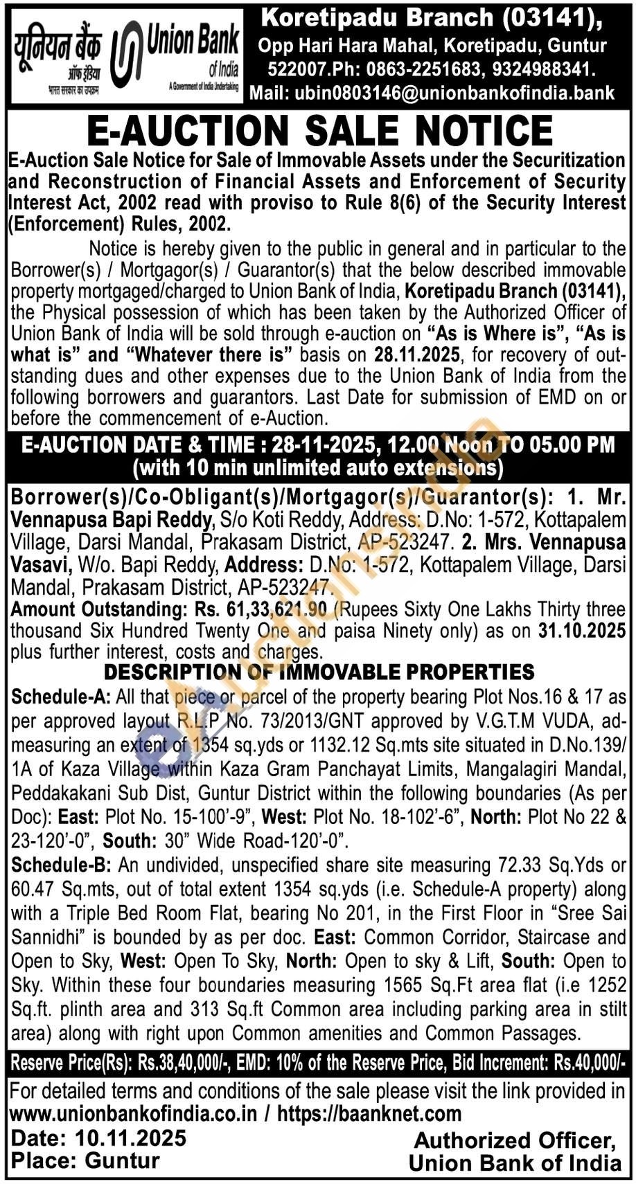 Schedule-A: All that piece or parcel of the property bearing Plot Nos. 16 & 17 as per approved layout R.L.P No. 73/2013/GNT approved by V.G.T.M VUDA, ad-measuring an extent of 1354 sq.yds or 1132.12 Sq.mts site situated in D.No.139/1A of Kaza Village within Kaza Gram Panchayat Limits, Mangalagiri Mandal, Peddakakani Sub Dist, Guntur District within the following boundaries (As per Doc): East: Plot No. 15-100'-9", West: Plot No. 18-102'-6", North: Plot No 22 & 23-120'-0", South: 30" Wide Road-120'-0". Schedule-B: An undivided, unspecified share site measuring 72.33 Sq. Yds or 60.47 Sq.mts, out of total extent 1354 sq.yds (i.e. Schedule-A property) along with a Triple Bed Room Flat, bearing No 201, in the First Floor in "Sree Sai Sannidhi" is bounded by as per doc. East: Common Corridor, Staircase and Open to Sky, West: Open To Sky, North: Open to sky & Lift, South: Open to Sky. Within these four boundaries measuring 1565 Sq.Ft area flat (i.e 1252 Sq.ft. plinth area and 313 Sq.ft Common area including parking area in stilt area) along with right upon Common amenities and Common Passages