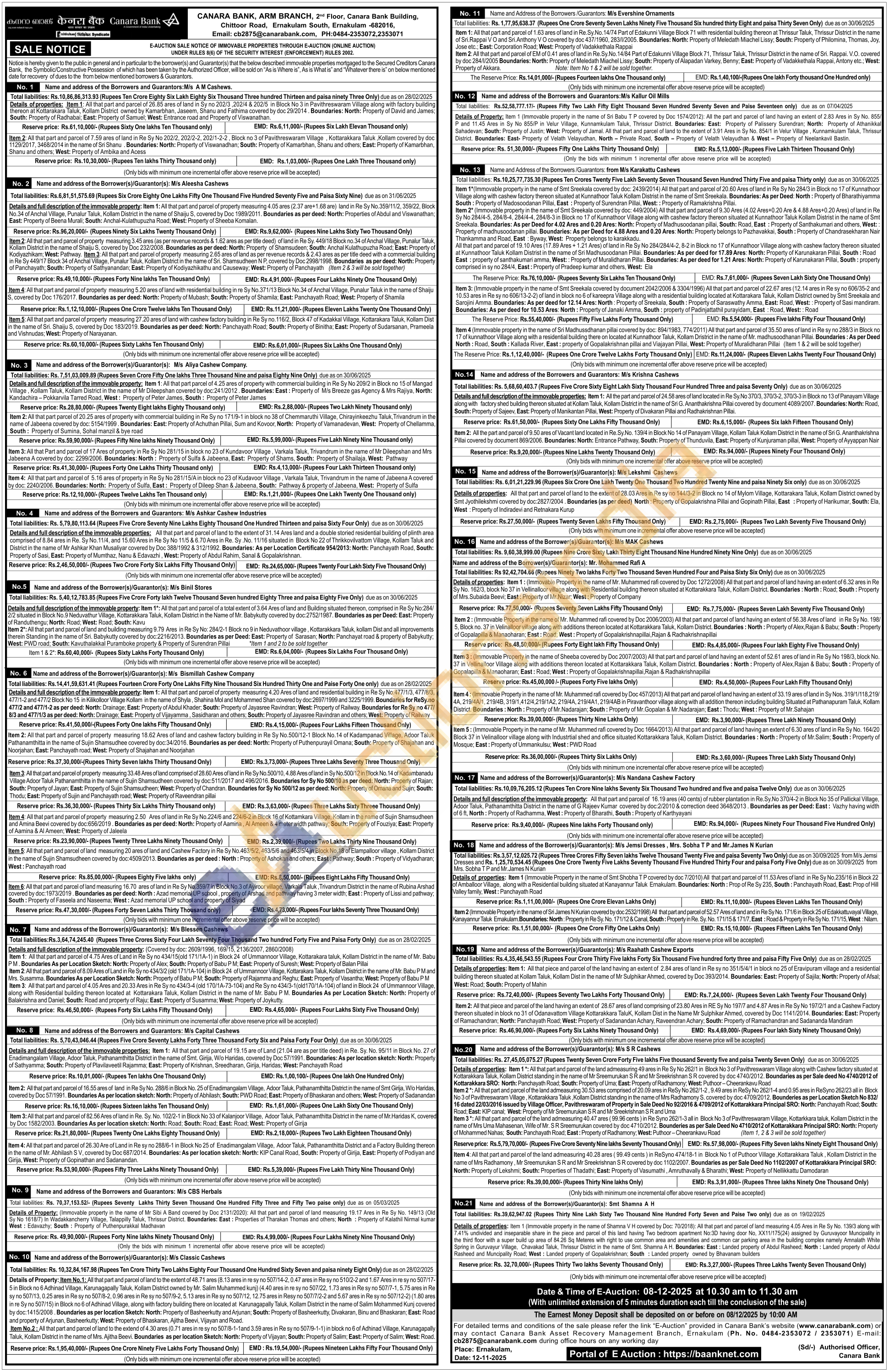 Item 3: (Immovable property in the name of Smt Sreekala covered by document 2042/2006 & 3304/1996) All that part and parcel of 22.67 ares (12.14 ares in Re sy no 606/35-2 and 10.53 ares in Re sy no 606/13-2-2) of land in block no 6 of kareepra Village along with a residential building located at Kottarakara Taluk, Kollam District owned by Smt Sreekala and Sarojini Amma. Boundaries: As per deed for 12.14 Ares: North: Property of Sreekala, South: Property of Saraswathy Amma, East: Road, West:: Property of Sasi mandiram. Boundaries: As per deed for 10.53 Ares: North: Property of Janaki Amma, South: property of Padinjattathil purayidam, East: Road, West:: Road