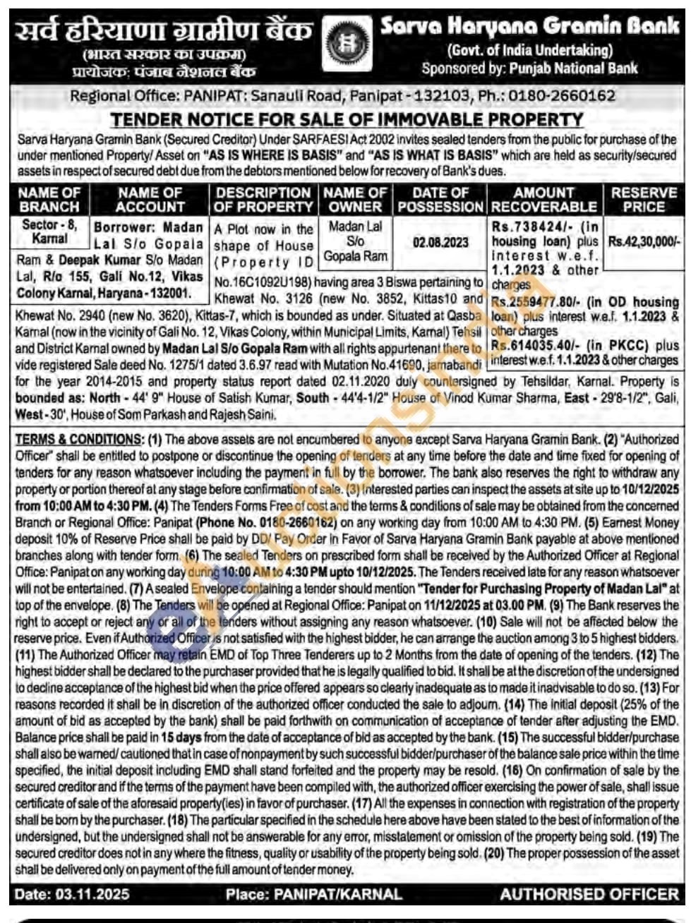 A Plot now in the shape of House (Property ID No. 16C10921198) having area 3 Biswa pertaining to Khewat No. 3126 (new No. 3852, Kittas10 and Khewat No. 2940 (new No. 3620), Kittas-7, which is bounded as under. Situated at Qasba Kamal (now in the vicinity of Gali No. 12, Vikas Colony, within Municipal Limits, Karnal) Tehsil and District Karnal owned by Madari Lal S/o Gopala Ram with all rights appurtenant there to vide registered Sale deed No. 1275/1 dated 3.6.97 read with Mutation No.41690, jamabaridi for the year 2014-2015 and property status report dated 02.11.2020 duly countersigned by Tehsildar, Karnal. Property is bounded as: North-44' 9" House of Satish Kumar, South-44'4-1/2" House of Vinod Kumar Sharma, East-29'8-1/2", Gali, West-30', House of Som Parkash and Rajesh Saini.