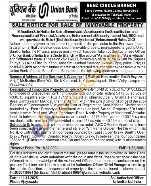 Schedule A: An extent of 48 Sq. Yds., or 40.134 Sq.Mts., of Undivided of unspecified joint right house site out of total extent 5178.50 sq.yds or 4330.15 sq.mtrs site in R.S.151/2 situated at chinnaoutpally Grama Panchayat Area, Gannavaram Mandal, Krishna District., within the jurisdication of office of the sub-Registry of Gannavaram, Vijayawada District Registration Area, Krishna District being bounded by: East: Property of Maddineni Venkaiah land, South: Property of Dr. Lanka Venkateswara Rao Land, West: Panchayat Road, North: Property of Maddineni Venkaiah land. In between this four boundaries an extent of 5178.80sq.yds or 4330.15 sq.mts residential site in which joint undivided share of 48 sq.yds or 40.134 sq.mts of site. Schedule B: In the above said total extent of schedule ARCC Roofed Apartments have been constructed under the name and style of "Sri Rams Golden Nest"in which Flat No.JD-5 Jaithri Block in Third Floor being bounded by: East: Open to sky, South: Open to sky, West: Common Corridor, North: Open to sky. In between the four boundaries 1650sq.ft.. (Plinth area, common area, Car and Scooter Parking area) with its all easement rights.