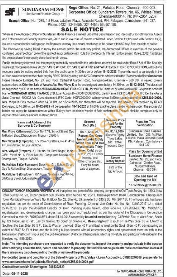 DESCRIPTION OF SECURED PROPERTY: All that piece and parcel of the property comprised in Old Town Survey No. 189/3, New Town Survey No. 23, as per present Sub Division Town Survey No. 23/11, Thalavaipattinam Road, Gandhipuram, Dharapuram Town Municipal Revenue Ward No. 6, Block No. 28, Site No. 39, an extent of 245.9 Sq. Mtr (2647 Sq Ftj of house site has been regularised as per the order of Commissioner of Town Planning, Chennai vide Order Na. Ka. No. 13193/2017 LA1, dated 27.09.2018, as per the Assistant Director of Town Planning (Gen) Salem, order vide No. SPFW/SRDD No. 1980/2018, regularisation and developments charges has been paid and regularised, as per the order of the Dharapuram Corporation Commission, vide No. 5079/2018/F1, dated 31.10.2018 is morefully bounded on the North by: 23 Ft wide East to West Road, South by: 12 Ft wide East to Path, East by: Site No. 38, South by: Site No. 40. Measuring North to south on the West Side: 654 Ft. North to South on the East Side. 66% FL, East to West on the North Side: 40 Ft and East to West on the South Side: 40 Ft, admeasuring an extent of 2647 Sq.Ft of land and the building builtup thereon with all easmentary rights and appurtenant there on with in the Registration District of Tirupur and the Sub Registration District of Dharapuram, which is morefully and particularly described in the title deed no. 1799/2023