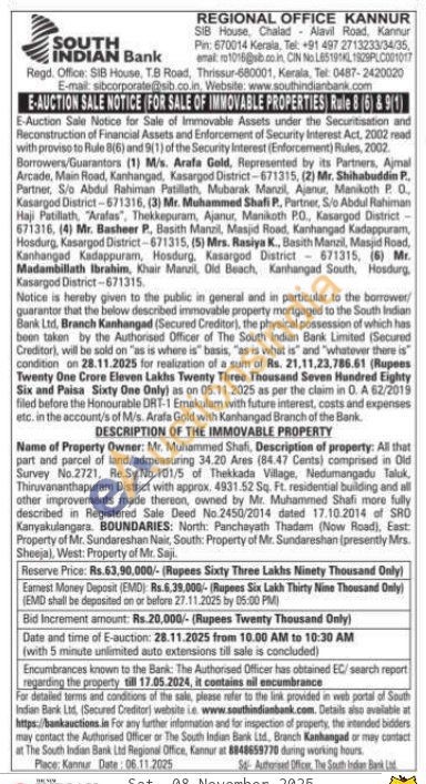 Name of Property Owner: Mr. Muhammed Shafi, Description of property: All that part and parcel of land admeasuring 34.20 Ares (84.47 Cents) comprised in Old Survey No.2721, Re.Sy.No.101/5 of Thekkada Village, Nedumangadu Taluk, Thiruvananthapuram District with approx. 4931.52 Sq. Ft. residential building and all ather improvements made thereon, owned by Mr. Muhammed Shafi more fully described in Registered Sale Deed No.2450/2014 dated 17.10.2014 of SRO Kanyakulangara. BOUNDARIES: North: Panchayath Thadam (Now Roadi, East Property of Mr. Sundareshan Nair, South: Property of Mr. Sundareshan (presently Mrs. Sheeja), West: Property of Mr. Saji
