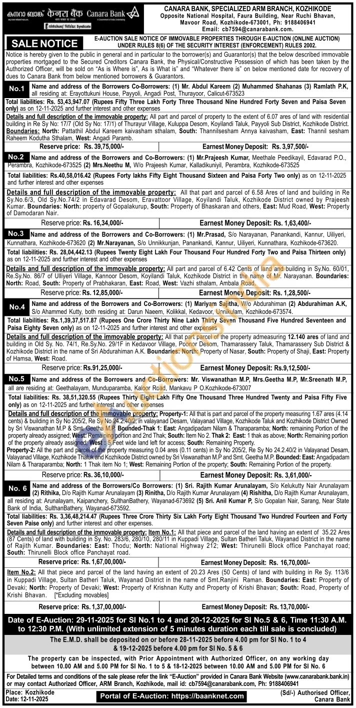 Details and full description of the immovable property: Item No.1: All that piece and parcel of the land having an extent of 35.22 Ares (87 Cents) of land with building in Sy. No. 283/6, 280/10, 280/11 in Kuppadi Village, Sultan Batheri Taluk, Wayanad District in the name of Rajith Kumar. Boundaries: East: Thodu; North: National Highway 212; West: Thirunelli Block office Panchayat road; South: Thirunelli Block office Panchayat road.