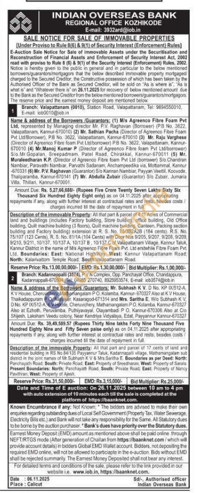 Description of the immovable Property: All that part & parcel of 4.11 Acres of Commercial land and buildings (includes Factory building, Store building, office building, Old Office building, Quilt machine building (3 floors), Quilt machine building, Canteen, Packing section building and Factory building) extension at R. S. No. 75/382A2B (184 cents). R.S. No. 75/107 (123 Cents), R. S. No. 81/14 (104 Cents) with Door Nos 9/205, 9/207, 9/208, 9/209, 9/210, 9/211, 10/137, 10/137 A, 10/137 8. 10/137 C of Valapattanam Vilage, Kannur Taluk, Kannur District in the name of Mis Agreenco Fibre Foam Pvt. Ltd erstwhile Fibre Foam Pvt. Ltd. Boundaries: East: National HighWay, West: Kannur Valapattanam Road: North: Kalarivattom Temple Road: South:Valapattanam Road.