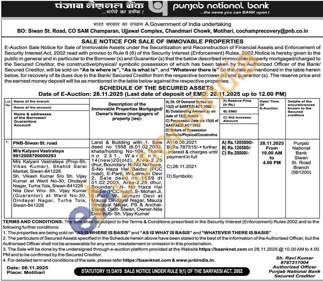 Land & Building with 1. Sale deed no 1558 dt.01.02.2003, khata/holding No-169, Thana no 231 Ward no 14(new)20(old), Area-2.25 dhur, Boundary: N-Niz No haza, S-No Haza Hal Baidar (PCC road), E-Parti, W-Lalmuni Devi 2. Sale deed no 1559 dt 01.02.2003, Area-2.25 dhur, Boundary: N- No Haza Hal Baidar (PCC road), S-Mohan Ji, E-Parti W- lalmuni Devi at Mauza Dindayal Nagar, Mauza Dindayal Nagar, PS & Anchal-Siwan, Distt-Siwan, Owner-Nila Devi W/o-Sh. Vijay Kumar