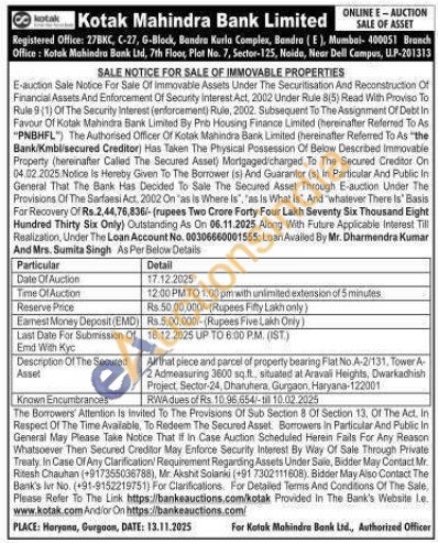 All that piece and parcel of property bearing Flat No A-2/131, Tower A 2. Admeasuring 3600 sq.ft., situated at Aravail Heights, Dwarkadhish Project Sector-24, Dharuhera, Gurgaon, Haryana-122001