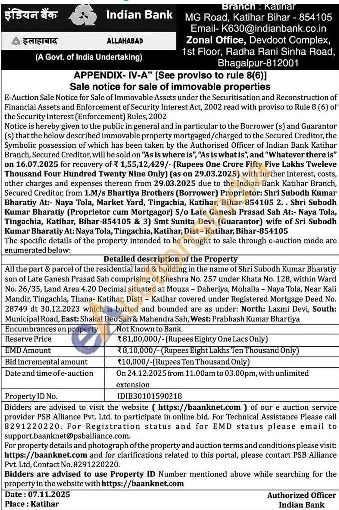 All the part & parcel of the residential land & building in the name of Shri Subodh Kumar Bharatiy son of Late Ganesh Prasad Sah comprising of Kheshra No. 257 under Khata No. 128, within Ward No. 26/35, Land Area 4.20 Decimal situated at Mouza - Daheriya, Mohalla - Naya Tola, Near Kali Mandir, Tingachia, Thana- Katihar, Distt - Katihar covered under Registered Mortgage Deed No. 28749 dt 30.12.2023 which is butted and bounded are as under: North: Laxmi Devi, South: Municipal Road, East: Shakal Deo Sah & Mahendra Sah, West: Prabhash Kumar Bhartiya