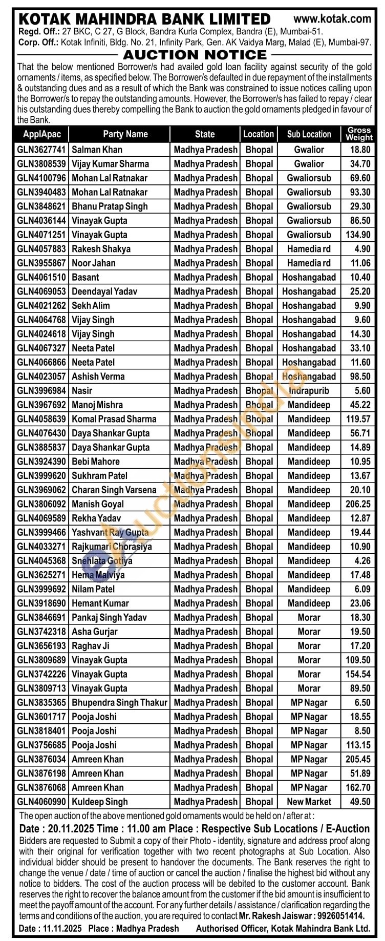 Kotak Mahindra Bank Gold Auctions Auction in Mumbai