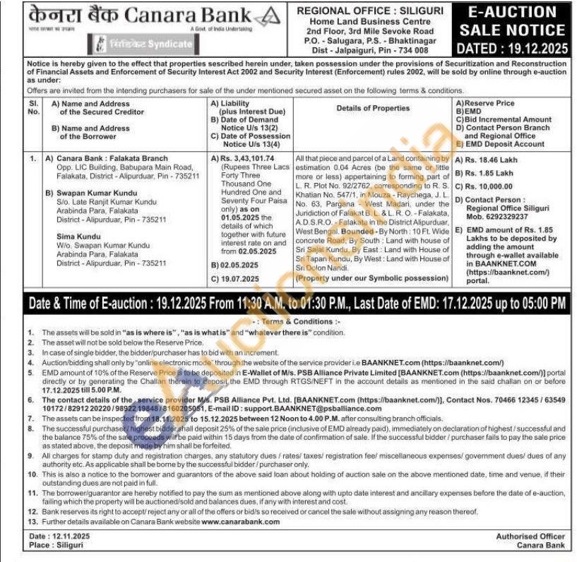 All that piece and parcel of a Land containing by estimation 0.04 Acres (be the same or little more or less) appertaining to forming part of L. R. Plot No. 92/2762, corresponding to R. S. Khatian No. 547/1, in Mouza-Raychega, J. L No. 63, Pargana West Madari, under the Juridiction of Falakat B. L. & L.RO.-Falakata, A.D.S.R.O.-Falakata in the District Alipurduar, West Bengal. Bounded-By North: 10 Ft. Wide concrete Road, By South: Land with house of Sri Sajal Kundu, By East Land with House of Sri Tapan Kundu, By West: Land with House of Sri Dolon Nandi.