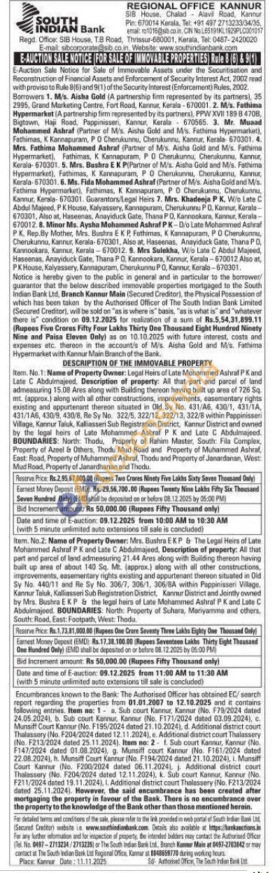 Description of property: All that part and parcel of land admeasuring 21.44 Ares along with Building thereon having built up area of about 140 Sq. Mt. (approx.) along with all other constructions, improvements, easementary rights existing and appurtenant thereon situated in Old Sy No. 440/11 and Re Sy No. 306/7, 306/1, 306/8A within Pappinisseri Village, Kannur Taluk, Kalliasseri Sub Registration District, Kannur District and Jointly owned by Mrs. Bushra EKP & the legal heirs of Late Mohammed Ashraf P K and Late C Abdulmajeed. BOUNDARIES: North: Property of Suhara, Mariyamma and others, South: Road, East: Footpath, West: Thodu.