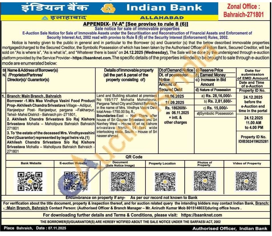 Land and Building situated at premises No 195/177 Mohalla Moholipura, Pargana Tehsil City and District Bahraich in the name of Mrs. Vindhya Vasini Devi total Area-1750.00 Sq. ft., Boundaries-East Nali There after house of Sri Gaurav Srivastava and Sri Nanhey West - House of sri raj kishore srivastava North- 14 feet wide interlocking rasta, South - House of Sri naseer ahmad