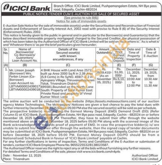 4 BHK House with Land Area 2572 built up Area 2000 Sq.ft in 2.39 Ares (5.9 Cents) in Re SyNO. 459/7-2-2 in Ayirupara Village, Thiruvanathapuram Taluk, Trivandrum District 4 BHK House with Land Area 2572. 695581.Bounded on the North: Lone South: Property of Sunil Kumar East: Private Road and property of Vimal Kumar West: Lane