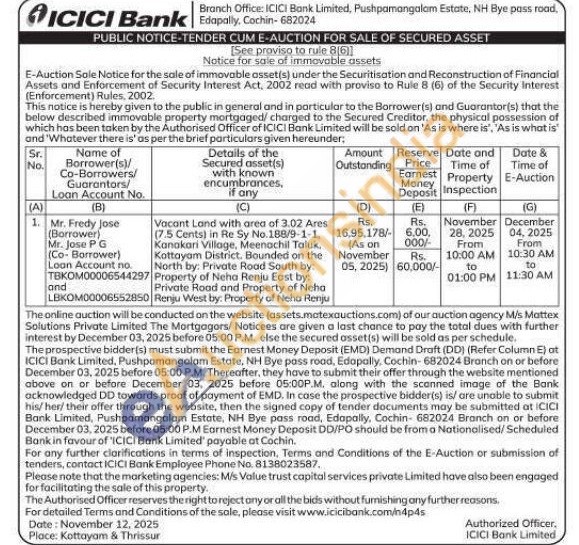 Vacant Land with area of 3.02 Ares (7.5 Cents) in Re Sy No. 188/9-1-1. Kanakari Village, Meenachil Taluk, Kottayam District. Bounded on the North by: Private Road South by: Property of Neha Renju East by: Private Road and Property of Neha Renju West by: Property of Neha Renju