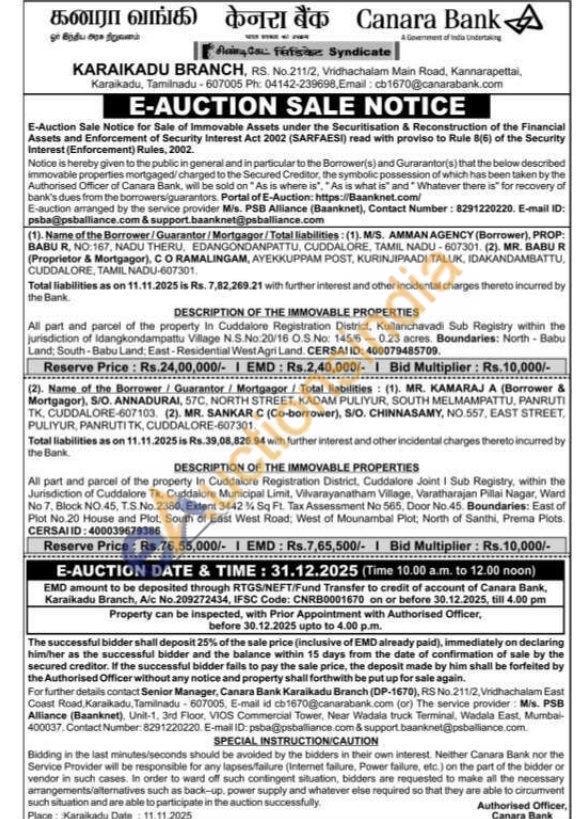 All part and parcel of the property In Cuddalore Registration District, Kullanchavadi Sub Registry within the jurisdiction of idangkondampattu Village N.S.No:20/16 O.S.No: 145/60.23 acres. Boundaries: North - Babu Land: South-Babu Land: East-Residential West Agri Land. CERSAIID: 400079485709.