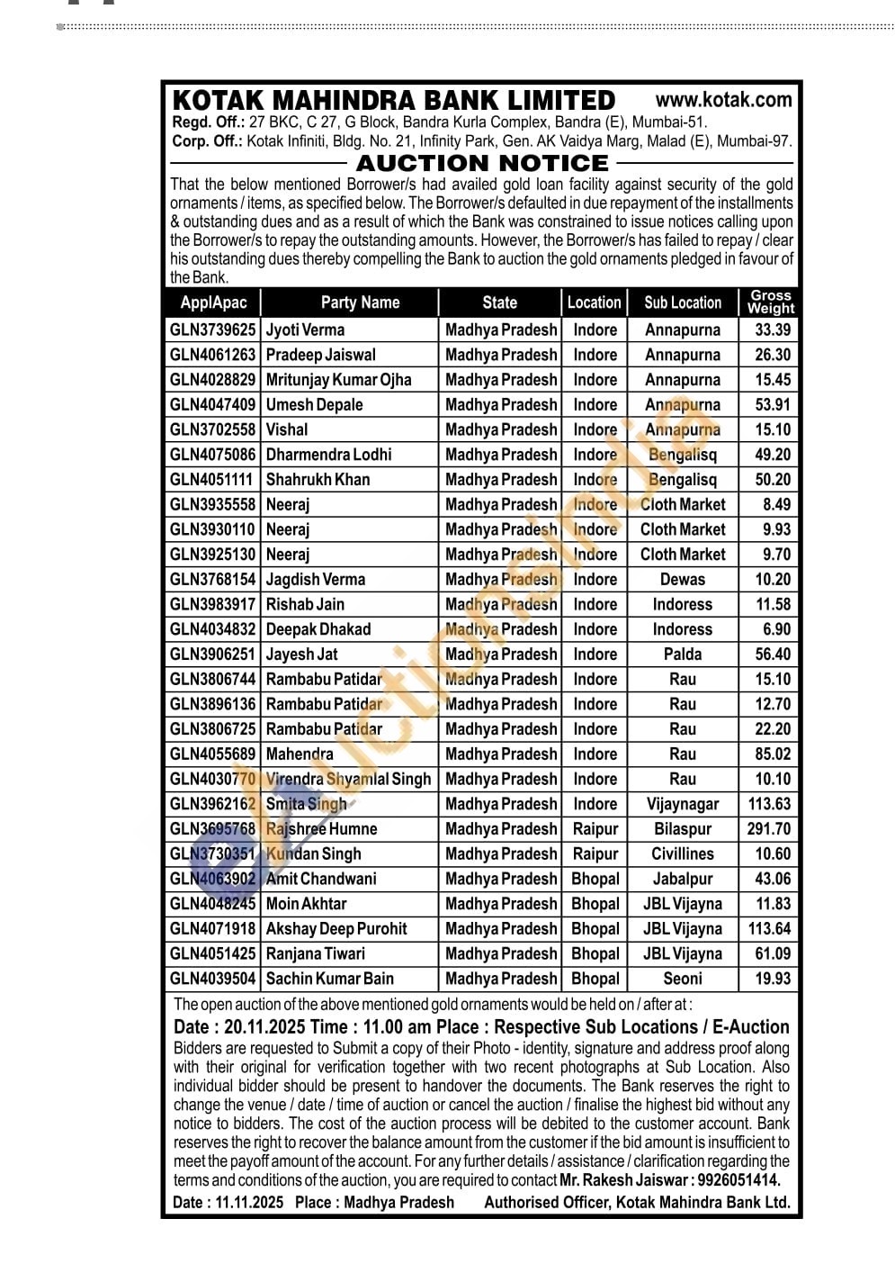 Kotak Mahindra Bank Gold Auctions Auction in Indore