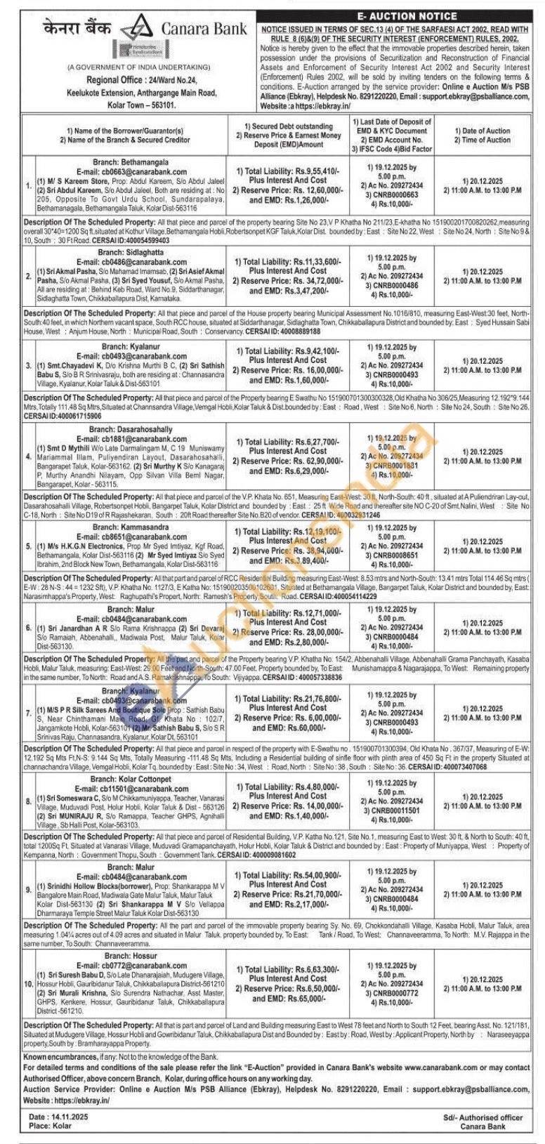 2) All that piece and parcel of the House property bearing Municipal Assessment No.1016/810, measuring East-West 30 feet, North-South: 40 feet, in which Northem vacant space, South RCC house, situated at Siddarthanagar, Sidlaghatta Town, Chikkaballapura District and bounded by. East: Syed Hussain Sabi House, West: Anjum House, North: Municipal Road, South Conservancy. CERSAI ID: 40008889188