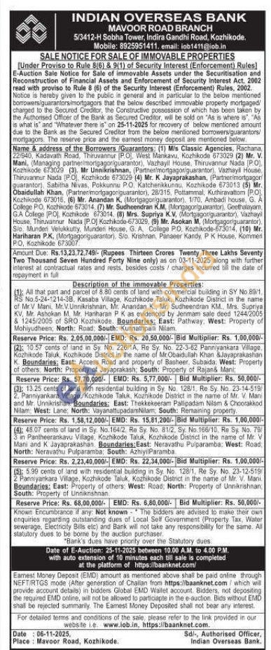 (5): 5.99 cents of land with residential building in Sy No. 128/1, Re Sy. No. 23-12-519 2 Panniyankara Village, Kozhikode Taluk, Kozhikode District in the name of Mr. V. Mani Boundaries: East: Properly of others: West: Road, North: Property of Unnikrishnan, South: Property of Unniknshnan
