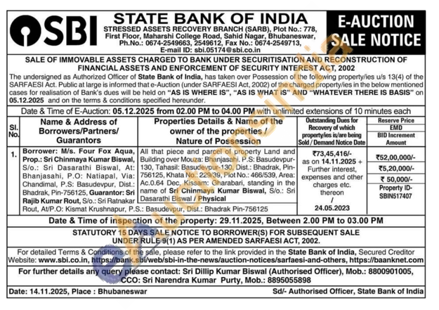 All that piece and parcel of property Land and Building over Mouza: Bhanjasahi. P.S: Basudevpur-130, Tahasil: Basudevpur-130, Dist.: Bhadrak, Pin-756125, Khata No.: 229/39, Plot No.: 466/539, Area: Ac.0.64 Dec, Kissam: Gharabari, standing in the name of Sri Chinmaya Kumar Biswal, S/o.: Sri Dasarathi Biswal/Physical