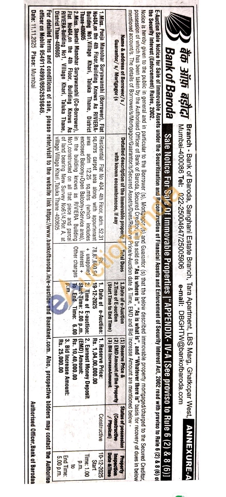 Residential Flat No 404, 4th Floor, adm. 52.31 sq.mtrs carpet area along with appurtenant area adm 12.25 sq.mtrs (which includes enclosed Balcony+Open Balcony Service area), in the building knows as RIVIERA Building No1, constructed on all that piece and parcel of land bearing New Survey No61/4, Plot A, at village Village Khari, Taluka Thane -400605