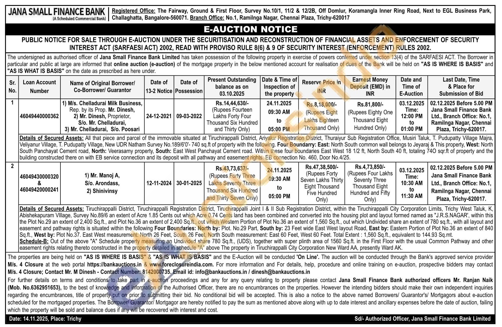 All that piece and parcel of the immovable situated at Tiruchirappalli District, Ariyalur Registration District, Thuraiyur Sub Registration Office, Musiri Taluk, T. Pudupatty Village Majra, Veliyanur Village, T. Pudupatty Village, New UDR Natham Survey No. 189/6'0'-740 sq.ft of property with the following. Four Boundarry: East: North South common wall belongs to Jeyaraj & This property, West: North South Panchayat Cement road, North: Veerasamy property, South: East West Panchayat Cement road. Within these four boundaries East West 18 1/2 ft, North South 40 ft, totaling 740 sqr.ft of property and the building constructed there on with EB service connection and its deposit with all pathway and easement rights. EB connection No. 460, Door No.4/25.