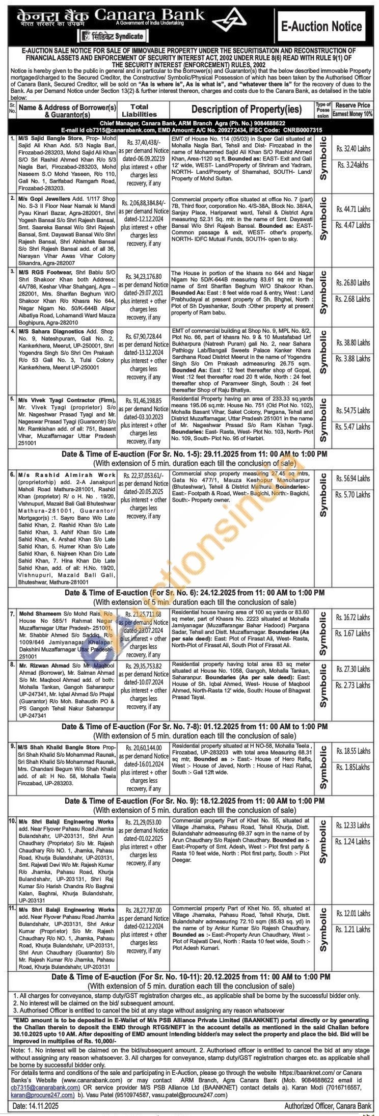 Contact Chief Manager, Canara Bank, ARM Branch Agra (Ph. No.) 9084688622