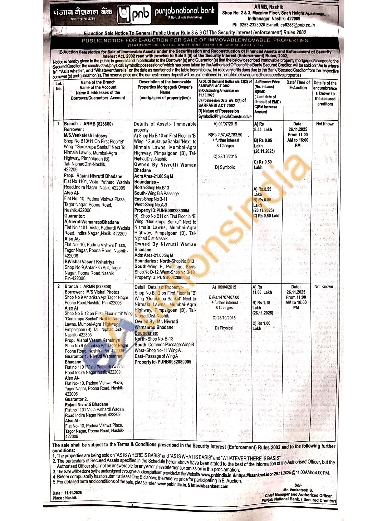 Details of Asset: Immovable property A) Shop No B.10 on First Floor in "B" Wing "Gurukrupa Sankul Next to Nirmala Lawns, Mumbai-Agra Highway, Pimpalgoan (B), Tal-Niphad Dist-Nashik Owned By Nivrutti Waman Bhadane Adm Area-21.00 SqM Boundaries- North-Shop No.B13 South-Wing B & Passage East-Shop No B-11 West-Shop No.A-9 Property ID:PUNB0082880004 B) Shop No B11 on First Floor in "B" Wing "Gurukrupa Sankul" Next to Nirmala Lawns, Mumbai-Agra Highway, Pimpalgoan (B), Tal-Niphad Dist-Nashik Owned By Nivrutti Waman Bhadane Adm Area-21.00 SqM Boundaries: North-Shop No.B13 South-Wing B, Passage, East-Shop No D-12, West-Shop No.B-10 Property ID: PUNB0082880003
