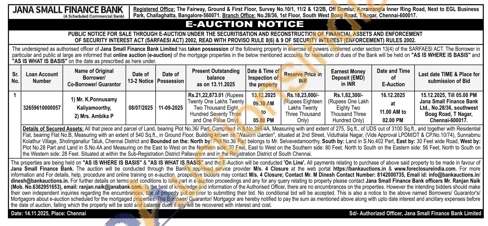 All that piece and parcel of Land, bearing Plot No.36/ Part, Comprised in S.No.389/4A, Measuring with and extent of 275, Sq.ft., of UDS out of 3100 Sq.ft., and together with Residential Flat, bearing Flat No.B, Measuring with an extent of 540 Sq.ft., in Ground Floor, Building known as "Wasiem Garden", situated at 2nd Street, Viduthalai Nagar, (Vide Approval LPDM/DT & CP.No.10/74), Sunnabmu Kolathur Village, Sholinganallur Taluk, Chennai District and Bounded on the: North by: Plot No.36 Part belongs to Mr. Selvavedamoorthy, South by: Land in S.No.402 Part, East by: 30 Feet wide Road, West by: Plot No.28 Part and Land in S.No.4A and Measuring on the East to West on the Northern side: 70 Feet, East to West on the Southern side: 80 Feet, North to South on the Eastern side: 56 Feet, North to South on the Western side: 28 Feet. Situated at within the Sub-Registration District Pallavaram and in the Registration District of South Chennai..