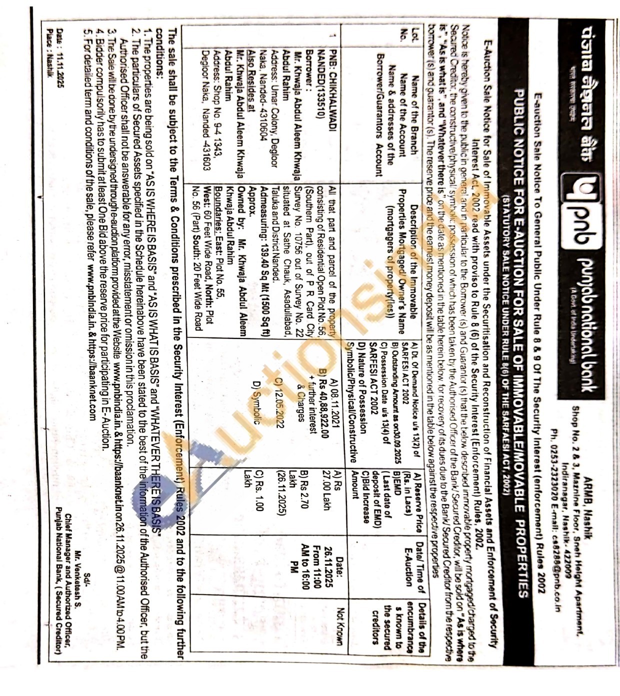 All that part and parcel of the property consisting of Residential Open Plot No. 56, (Southern Part), out of PR Card City Survey No. 10756 out of Survey No. 22 situated at Sathe Chauk, Asadullabad, Taluka and District Nanded. Admeasuring: 139.40 Sq Mt (1500 Sq ft) Approx Owned by: Mr. Khwaja Abdul Aleem Khwaja Abdul Rahim Boundaries: East: Pilot No. 55, West: 60 Feet Wide Road, North: Plot No. 56 (Part) South: 20 Feet Wide Road