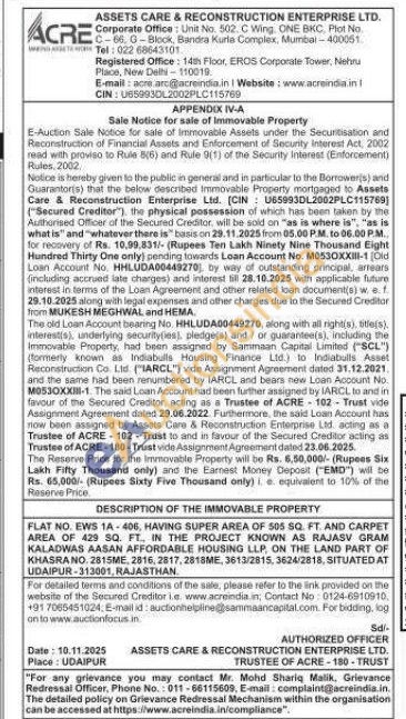 FLAT NO. EWS 1A-406, HAVING SUPER AREA OF 505 SQ. FT. AND CARPET AREA OF 429 SQ. FT. IN THE PROJECT KNOWN AS RAJASV GRAM KALADWAS AASAN AFFORDABLE HOUSING LLP, ON THE LAND PART OF KHASRA NO. 2815ME, 2816, 2017, 2818ME, 3613/2815, 3624/2818, SITUATED AT UDAIPUR-313001, RAJASTHAN.