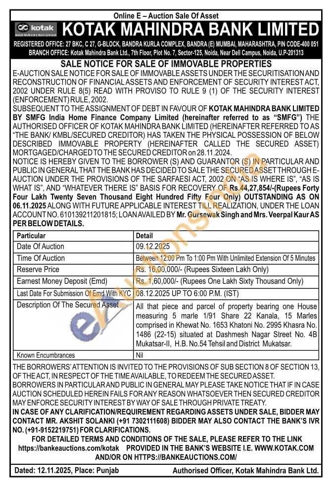 All that piece and parcel of property bearing one House measuring 5 marle 1/91 Share 22 Kanala, 15 Marles comprised in Khewat No. 1653 Khatoni No. 2995 Khasra No. 1486 (22-15) situated at Dashmesh Nagar Street No. 4B Mukatsar-II, H.B. No.54 Tehsil and District Mukatsar.