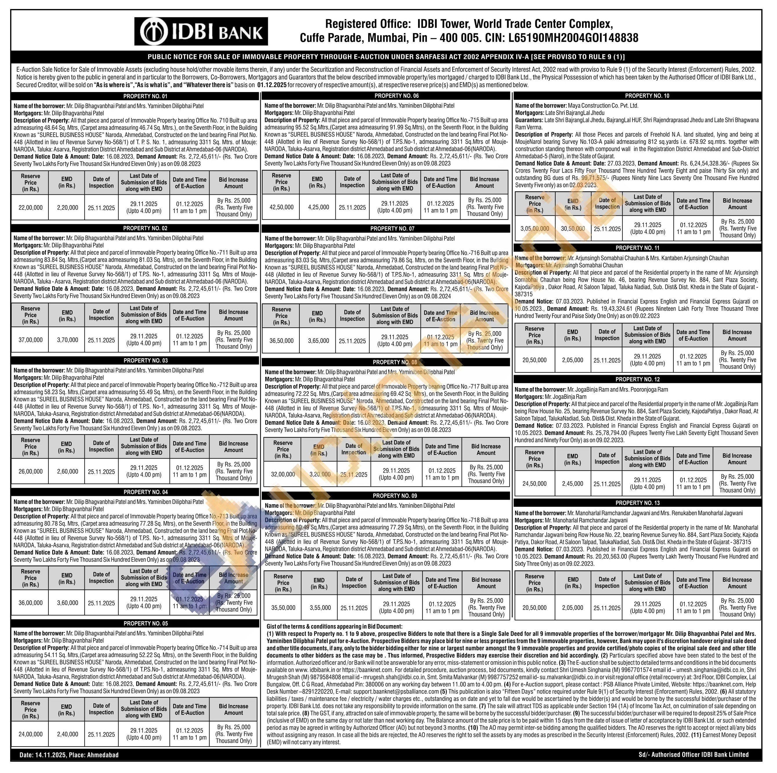 13) All that piece and parcel of the Residential property in the name of Mr. Manoharial Ramchandar Jagwani being Row House No. 22, bearing Revenue Survey No. 884, Sant Plaza Society, Kajoda Patiya, Dakor Road, At Saloon Talpad, TalukaNadiad, Sub. Dist& Dist. Kheda in the State of Gujarat-387315