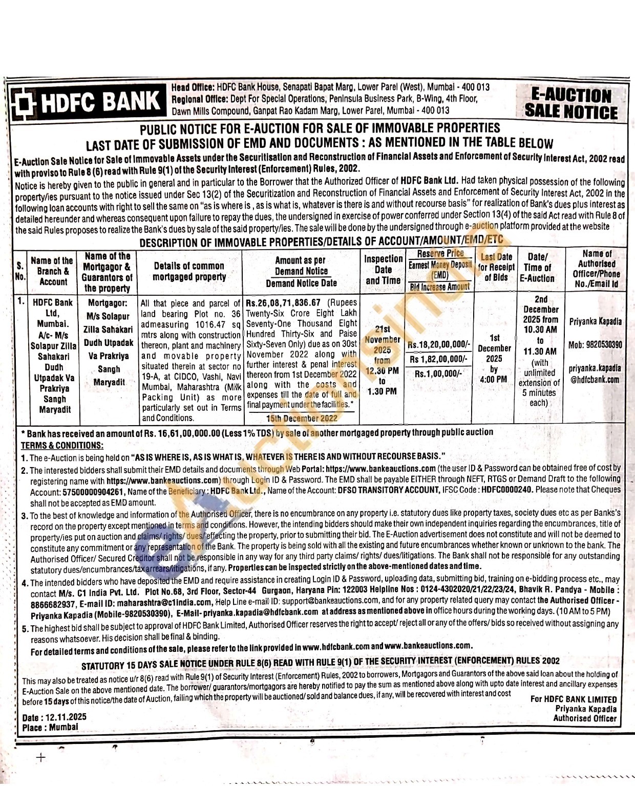 All that piece and parcel land bearing Plot no. and Conditions. admeasuring 1016.47 sq mtrs along with construction thereon, plant and machinery and movable property situated therein at sector 19-A, at CIDCO, Vashi, Navi Mumbai, Maharashtra (Mik Packing Unit) as more particularly set out in Terms and Conditions