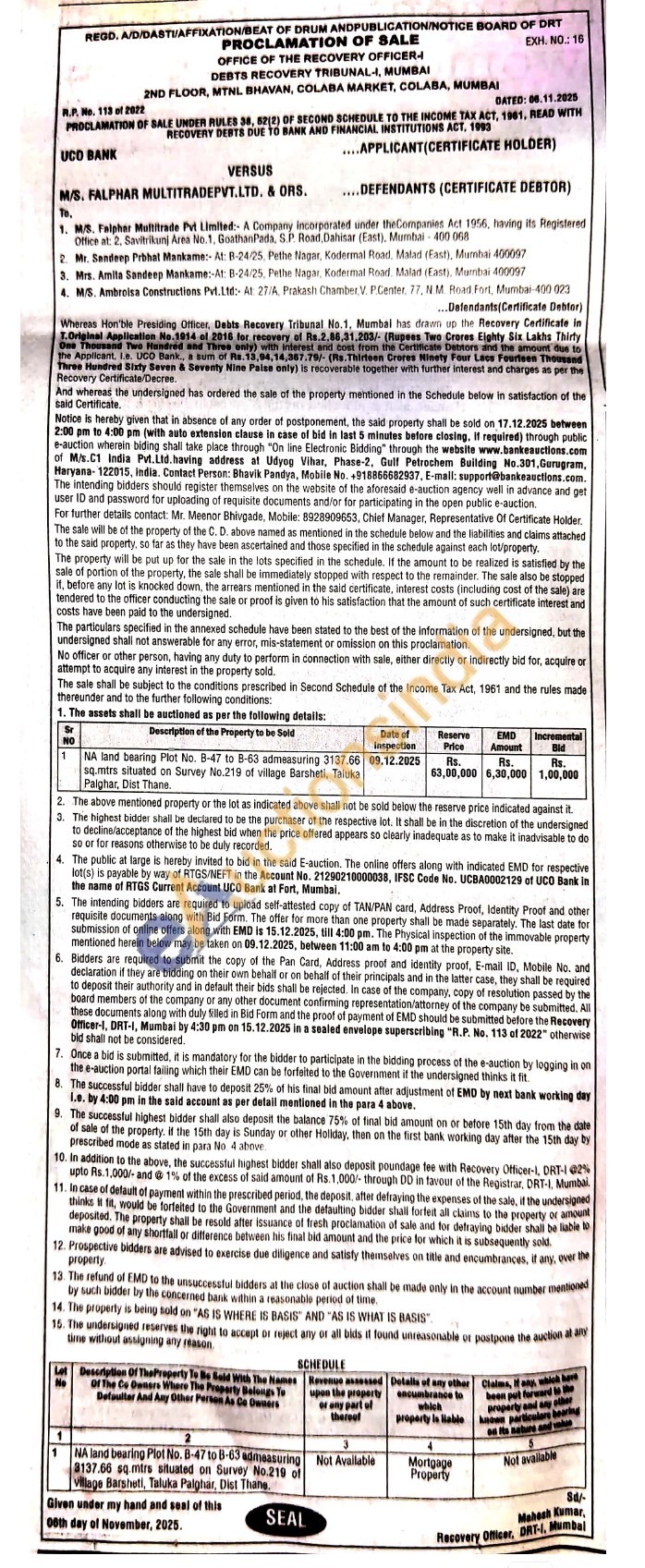 NA land bearing Plot No. B-47 to B-63 admeasuring 3137.66 sq.mtrs situated on Survey No.219 of village Barsheti, Taluka Palghar, Dist Thane
