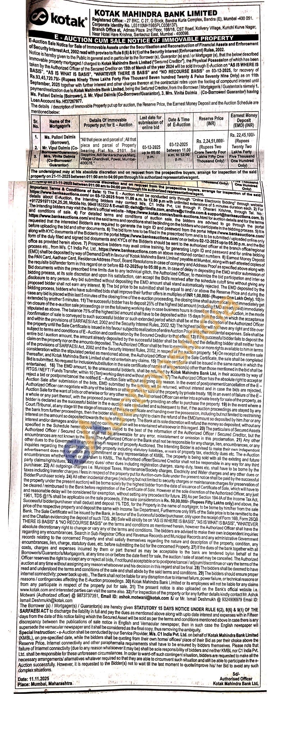 Mr. Ashok Motwani (Authorized officer) @ 9873737351or Mr. Ismail Deshmukh @ 9324906979