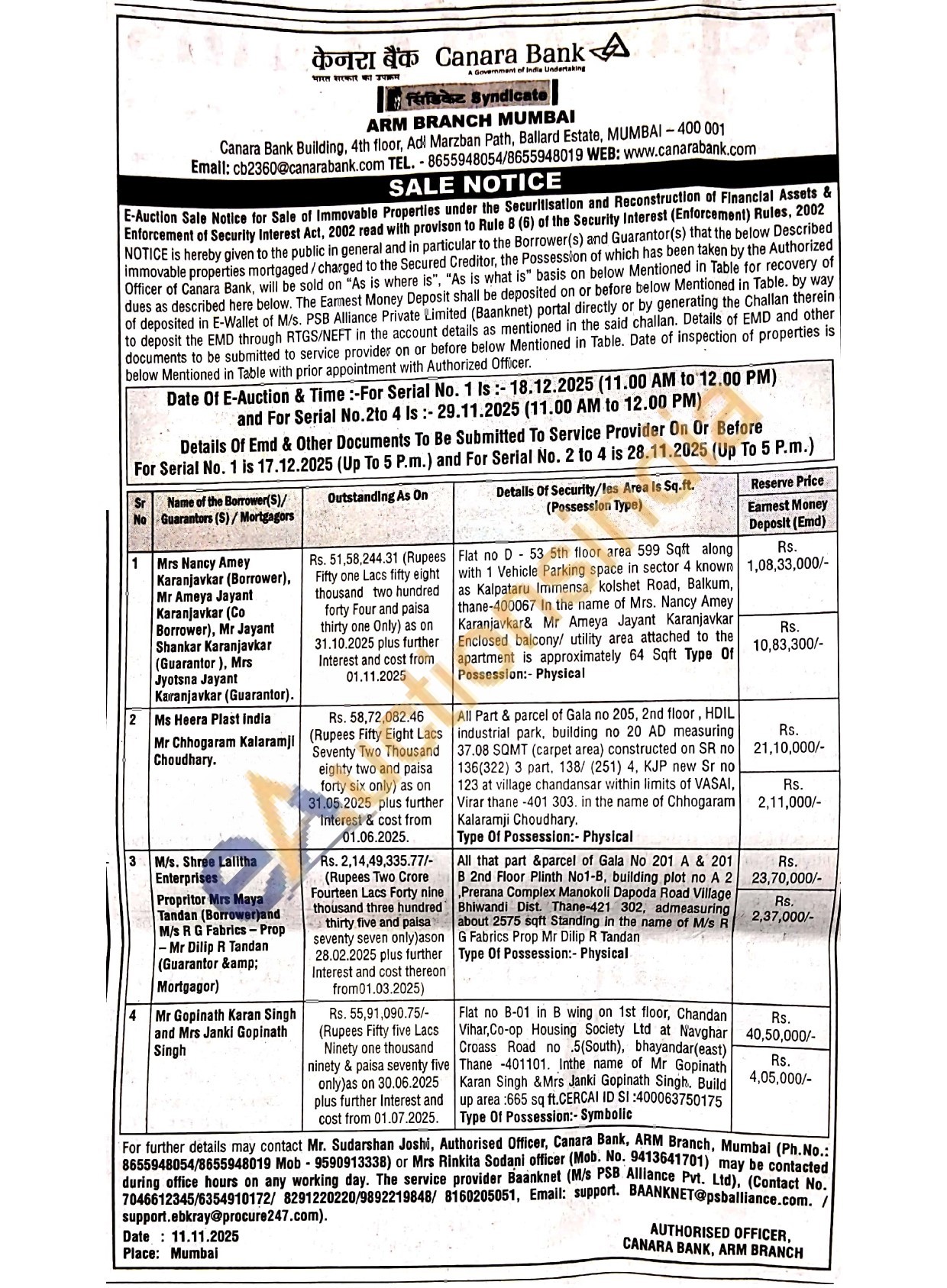 Mr. Sudarshan Joshi, Authorised Officer 8655948054/8655948019 Mob-9590913338) or Mrs Rinkita Sodani officer (Mob. No. 9413641701)
