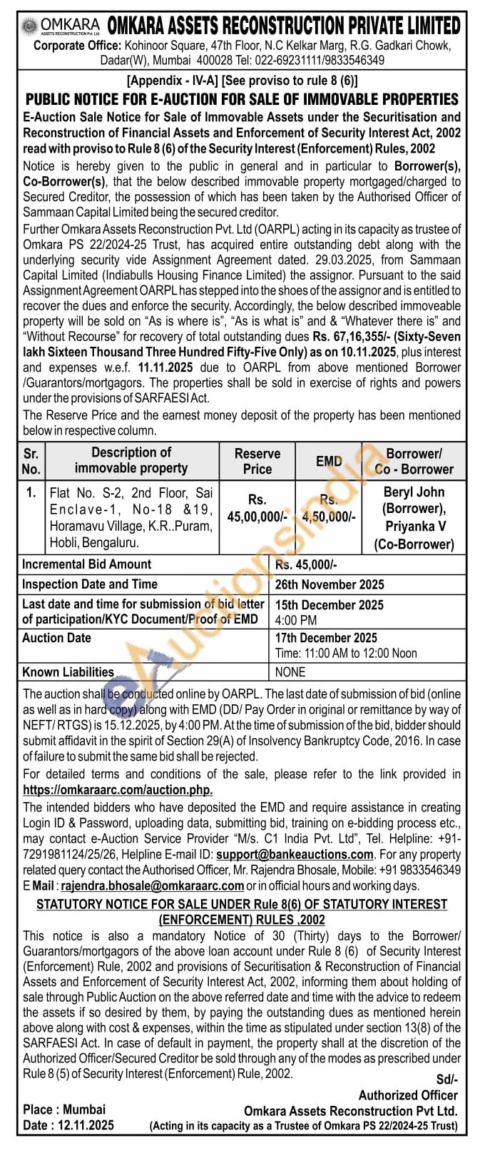 Flat No. S-2, 2nd Floor, Sai Enclave-1, No-18 &19, Horamavu Village, K.R..Puram, Hobli, Bengaluru.