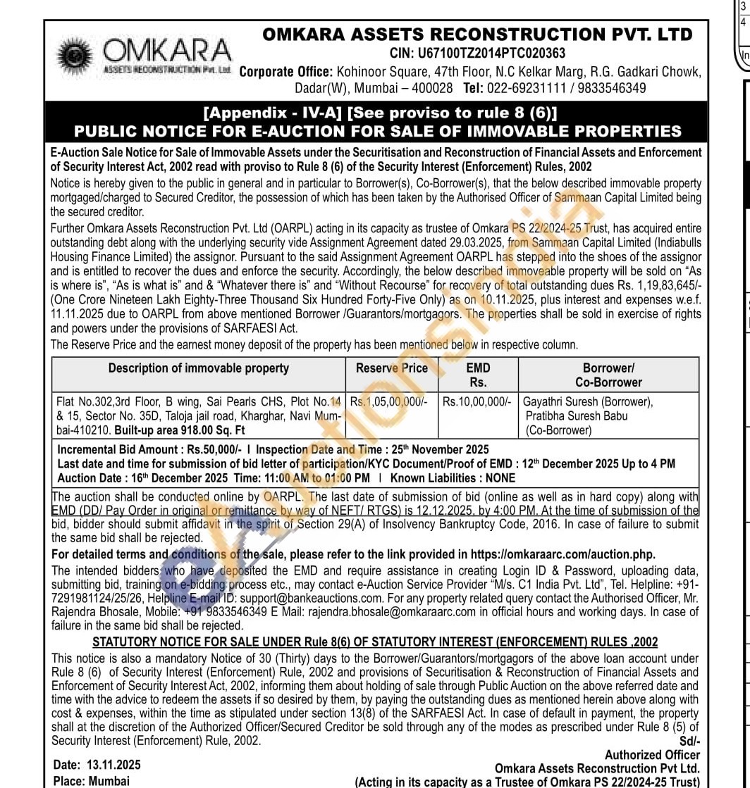 Flat No.302,3rd Floor, B wing, Sai Pearls CHS, Plot No.14 & 15, Sector No. 35D, Taloja jail road, Kharghar, Navi Mum-bai-410210. Built-up area 918.00 Sq. Ft