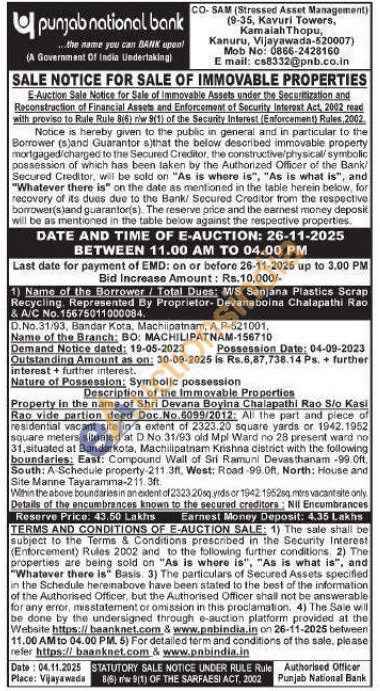 Property in the name of Shri Devana Boyina Chalapathi Rao S/o Kasi Rao vide partion deed Doc. No. 6099/2012: All the part and piece of residential vacant site in a extent of 2323.20 square yards or 1942.1952 square meters situated at D No. 31/93 old Mpl Ward no 28 present ward no 31, situated at Bandarkota, Machilipatnam Krishna district with the following boundaries: East: Compound Wall of Sri Ramuni Devasthanam -99.0ft. South: A-Schedule property-211.3ft, West: Road-99.0ft, North: House and Site Manne Tayaramma-211.3ft. Within the above boundaries in an extent of 2323 20sq yrds or 1942 1952sq. mtrs vacantsite