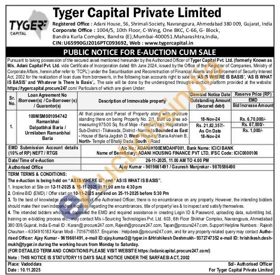 All that piece and Parcel of Property along with structure standing there on being Property No. 2/1, Built up area ad-measuring 975.00 Sq. fts of Moje-Fatepur(Vaji), Registration Sub-District-Tilakwada, District-Narmada Bounded as East -House of Baria Jagdish D, West-House of Baria Ashiwin B. North-Temple of Bhatiji Dada. South-Road