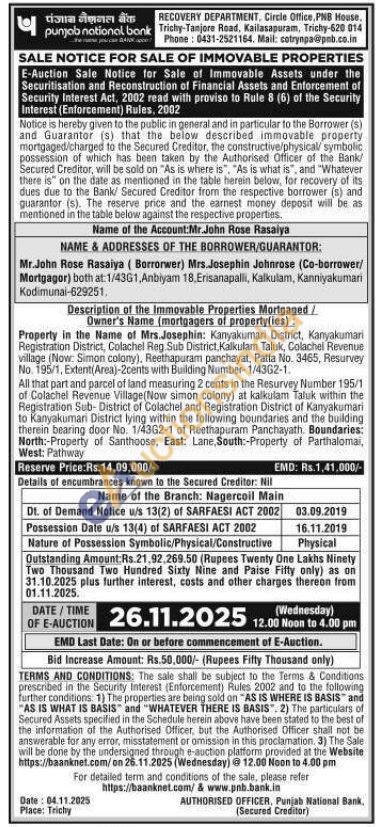 Property in the Name of Mrs.Josephin: Kanyakumari District, Kanyakumari Registration District, Colachel Reg Sub District, Kalkulam Taluk, Colachel Revenue village (Now: Simon colony), Reethapuram panchayat, Patta No. 3465, Resurvey No. 195/1, Extent(Area)-2cents with Building Number-1/4362-1. All that part and parcel of land measuring 2 cents in the Resurvey Number 195/1 of Colachel Revenue Village(Now simon colony) at kalkulam Taluk within the Registration Sub-District of Colachel and Registration District of Kanyakumari to Kanyakumari District lying within the following boundaries and the building therein bearing door No. 1/4362-1 of Reethapuram Panchayath. Boundaries: North:-Property of Santhoose, East: Lane, South:-Property of Parthalomai, West: Pathway