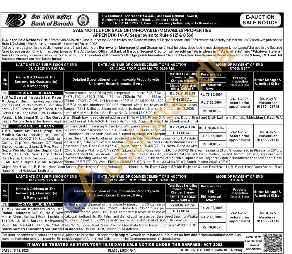 Land and Building bearing MС по. В-30-2189, area measuring 213-18/9, comprised in Khasrano.26//5/8, Khata no 1389/1445, as shown in Jamabandi for the year 2008-09, situated at Village tarf Sherpur kalan, The and District Ludhiana, registered vide sale deed bearing wasikano. 1642 dated 29.04.1987, in the name of Mrs. Madhu Gupta w/o Mr. Rajnder Gupta, boundaries as per sale deed, East-Rohit Gupta (77'-0"), West-Plotno. 26/4/5 (77'-0"), North-Road 30'wide (25-0"), South-Plotno. 26/6/1 (25-0") 2. Land and Building bearing MC no. B-30-21 89, area measuring 213-8/9, comprised in Khasra no.26//5/8, Khata no 1389/1 445, as shown in Jamabandi for the year 2008-09, situated at Village Tarf Sherpur kalan, The and District Ludhiana, registered vide sale deed bearing wasika no. 16526 dated 05.02.1987, in the name of Mr. Rohit Gupta s/o Mr. Rajinder Gupta, boundaries as per sale deed, East-Plotno. 26/5/7 (77'-0"), West-Plotno. 26/5/8 (77'-0"), North-Road 30'wide (25'-0"), South-Plotno.26/6/1 (25'-0"),