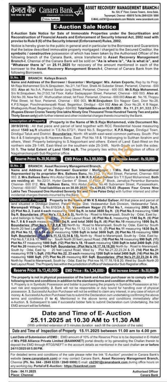 All that piece and parcel of land situated in Dindigul District, Palani Regis. Dist. Vedasandur Sub Division, Vedasandur Taluk, Marampadi Village, S.No.610/2A & 2B, Vasantham Nagar (1) Plot No.1, measuring 2063 Sq.ft. (2) Plot No.2, 3 and 4 each measuring 1200 Sq.ft. in total 3600 Sq.ft. (3) Plot No.5 measuring 1340 Sq.ft. Boundaries: (Plot No's. 1,2,3,4 & 5), North by: Road to Marampadi, South by: Odai, East by: Land belongs to Najini, West by: 20 feet Layout Road. (4) Plot No.6, measuring 1140 Sq.ft. (5) Plot No.7, 8 & 9 each measuring 1200 Sq.ft. and total 3600 Sq.ft. (6) Plot No. 10 measuring 1806 Sq.ft. Boundaries: (Plot No's.6,7,8,9 & 10) North by: Road to Marampadi, South by: Odai, East by: South North 20 feet Layout Road, West by: Plot No. 11,12,13,14 8 15. (7) Plot No.11 measuring 1630 Sq.ft. (8) Plot No.12, 13 & 14 each measuring 1200 Sqft in total 3600 Sqft. (9) Plot No.15 measuring 1000 Sqft. Boundaries: (Plot No's, 11,12,13,14 & 15), North by: Road to Marampadi, South by: Odai, East by: Plot No.6,7,8,9 8 10, West by: South North 20 feet Layout Road. (10) Plot No. 16 measuring 990 Sqft. (11) Plot No.17 measuring 1000 Sqft. (12) Plot No's. 18, 19 each measuring 1200 Sqft in total 2400 Sqft. (13) Plot No.20 measuring 1349 Sqft. Boundaries: (Plot No's. 16,17,18,19,20) North by: Road to Marampadi, South by Odal, East by 20 feet Layout Road, West by Plot No.21.22.23.24 & 25. (14) Plot No.21 measuring 1178% Sqft. (15) Plot No.22, 23 each measuring 1200 Sqft in total 2400 Sqft. (16) Plot No.24 measuring 1000 Sqft. (17) Plot No.25 measuring 831 Sqft. Boundaries: (Plot No's 21,22,23,24 & 25). North by: Road to Marampadi, South by: Odai, East by: Plot nos 16,17,18,19 & 20, West by: South North 20 feet Layout Road. The Property lies within the jurisdiction of office of Vedasandur Sub Registrar office
