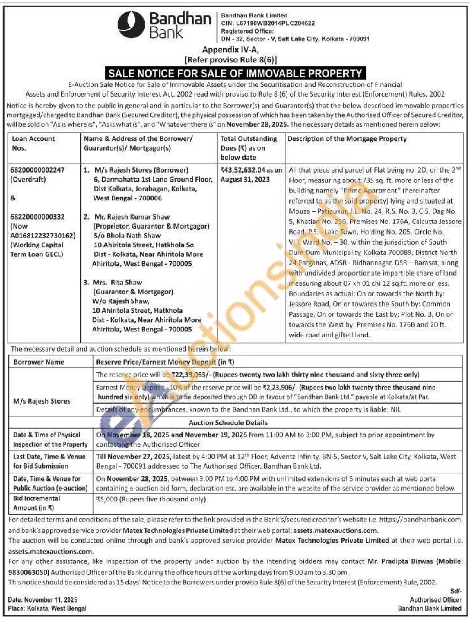 All that piece and parcel of Flat being no. 2D, on the 2nd Floor, measuring about 735 sq. ft. more or less of the building namely "Prime Apartment" (hereinafter referred to as the said property) lying and situated at Mouza-Patipukur, J.L. No. 24, R.S. No. 3, C.S. Dag No. 5. Khatian No. 256, Premises No. 176A, Calcutta Jessore Road, P.S.-Lake Town, Holding No. 205, Circle No.-VIII, Ward No.30, within the jurisdiction of South Dum Dum Municipality, Kolkata 700089, District North 24 Parganas, ADSR-Bidhannagar, DSR-Barasat, along with undivided proportionate impartible share of land measuring about 07 kh 01 chi 12 sq.ft. more or less Boundaries as actual: On or towards the North by: Jessore Road, On or towards the South by: Common Passage, On or towards the East by: Plot No. 3, On or towards the West by: Premises No. 1768 and 20 ft. wide road and gifted land